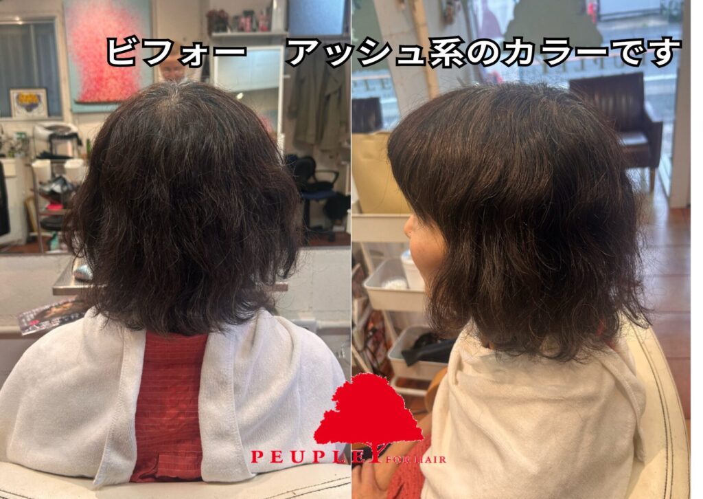 ビフォーの状態は、アッシュ系のカラーで、明るくする成分がやや弱めの色味でした。全体的に落ち着いたトーンでまとまりがありましたが、今回は少し印象を変えてみたいとのご希望でした。