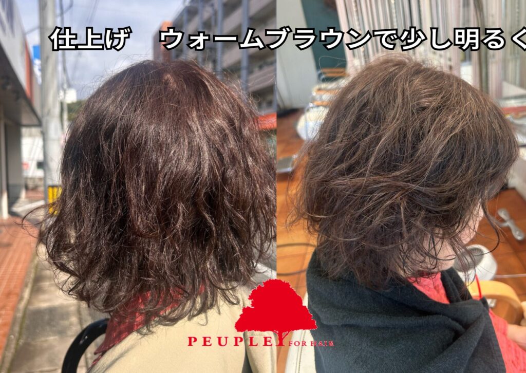 そこで、ウォームブラウンを選び、根元の白髪をしっかりカバーしながら、全体をほんの少しトーンアップしています。明るくしすぎず、自然な透明感とやわらかさが出るように仕上げました。